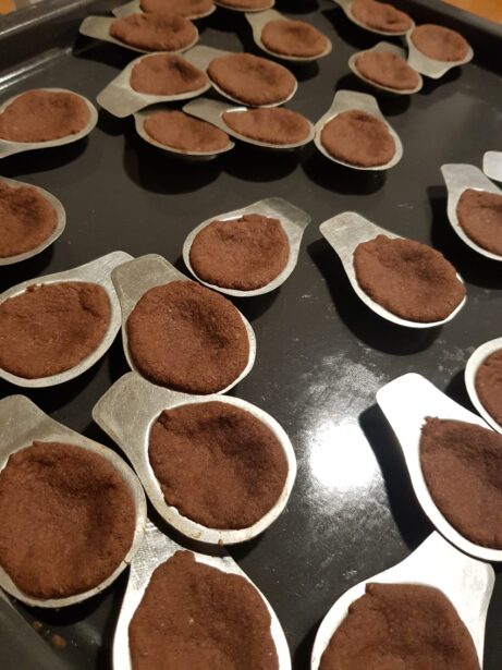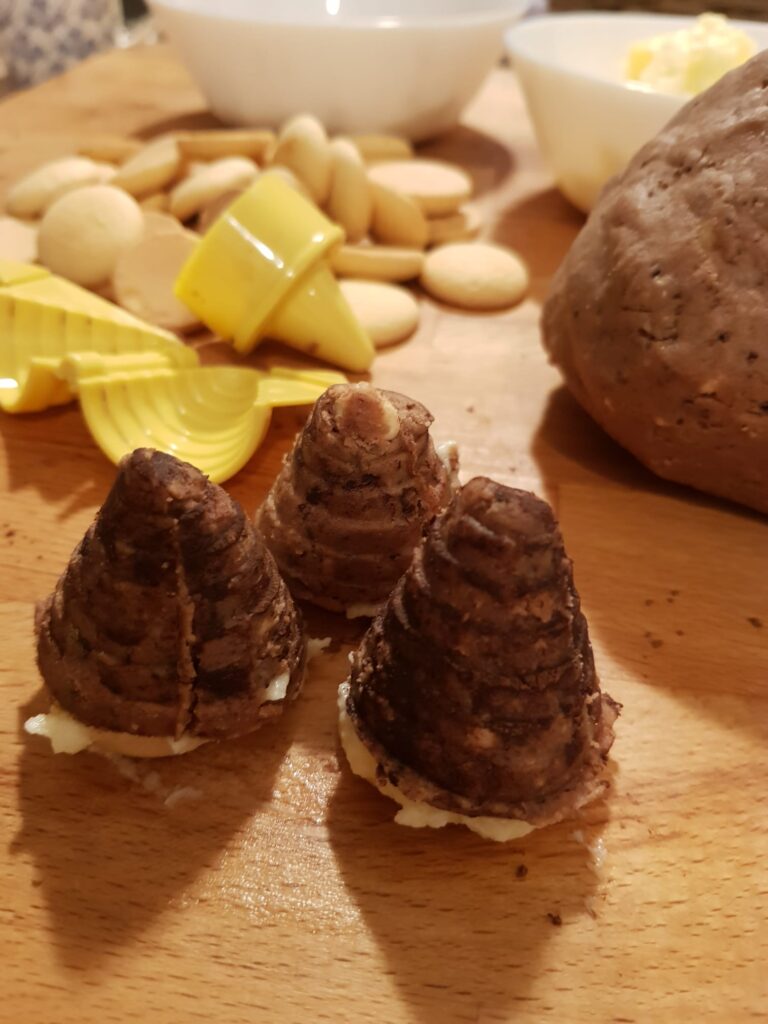 3. Kousky těsta vlačuj do formiček ve tvaru včelých úlků, které vysypej kakaem. Měl by v nich zůstat důlek na krém. Ideální je formička z Tescomy, co má protikus na vytvoření důlku a dokonce vykrajovátko na odpovídající základnu.