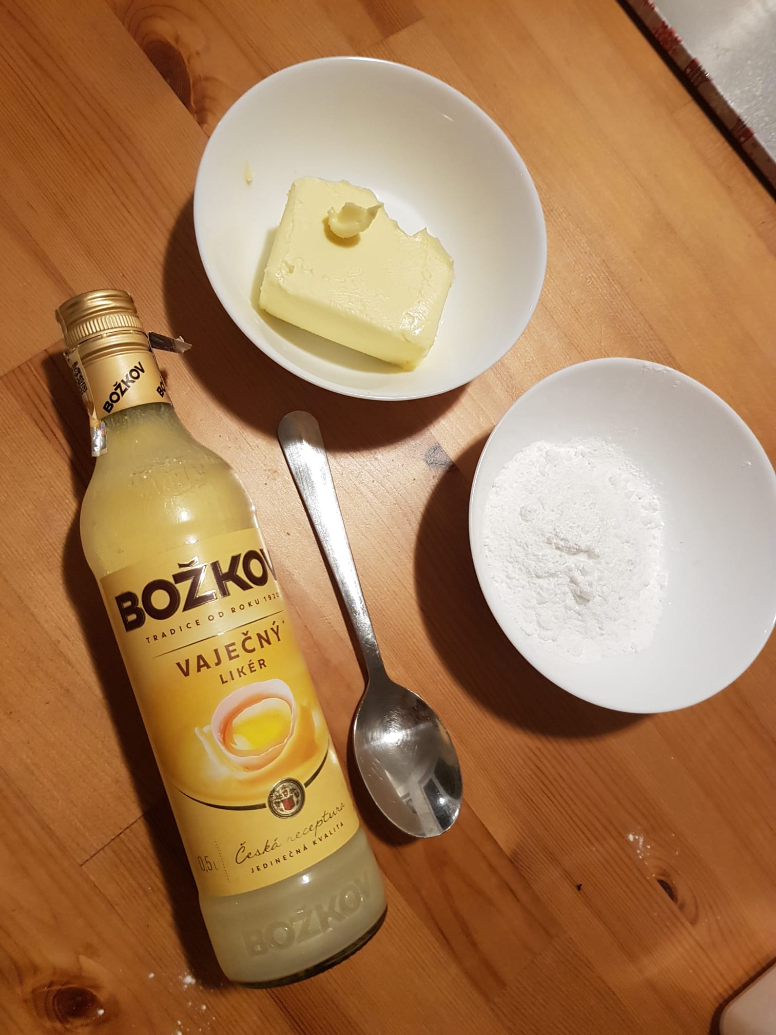 Krém vytvoříme smícháním másla, moučkového cukru a vaječného likéru. Dá se vyšlehat vidličkou, anebo ručním šlehačem.
