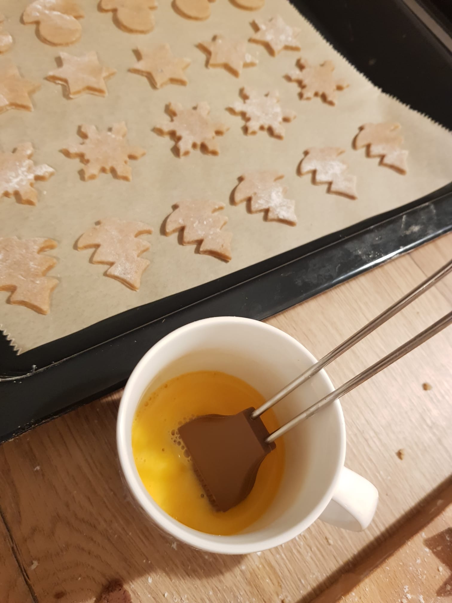6. Na vále vyválíme plát asi 3 mm silný, vykrajujeme tvary, potíráme je vajíčkem rozšlehaným s trochou mléka.
