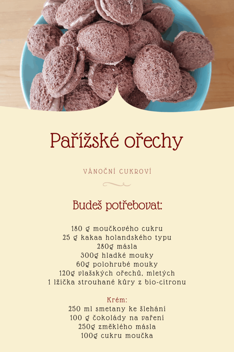 A proč „pařížské“? Název odkazuje k pařížskému krému – tmavému čokoládovému máslovému krému inspirovanému francouzskými dezerty. Právě on dává těmto ořechům jejich typickou, hluboce kakaovou a smyslnou chuť, díky které patří k nejvíce elegantnímu vánočním cukrovím vůbec.